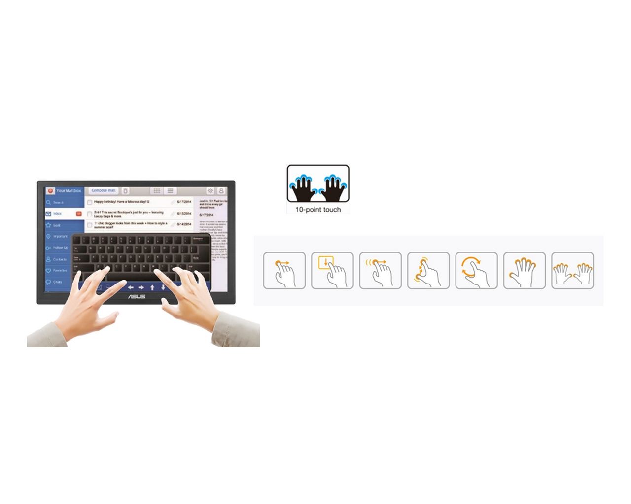 - Multi-touch felület (10 pontos érintés), amely lehetővé teszi virtuális billentyűzet használatát vagy több ujjal is kezelhető